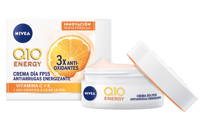 En la línea NIVEA Q10 Energy -especialmente adaptada a las necesidades de la piel de las mujeres jóvenes gracias a su nueva fórmula, que retrasa y previene la oxidación de las células-, encontramos esta crema de día FP15 antiarrugas energizante que contiene tres potentes antioxidantes (Q10 + Vitaminas C + E) que luchan contra los radicales libres, las arrugas y la fatiga de la piel, además de ofrecer hidratación y protección UV FP15.