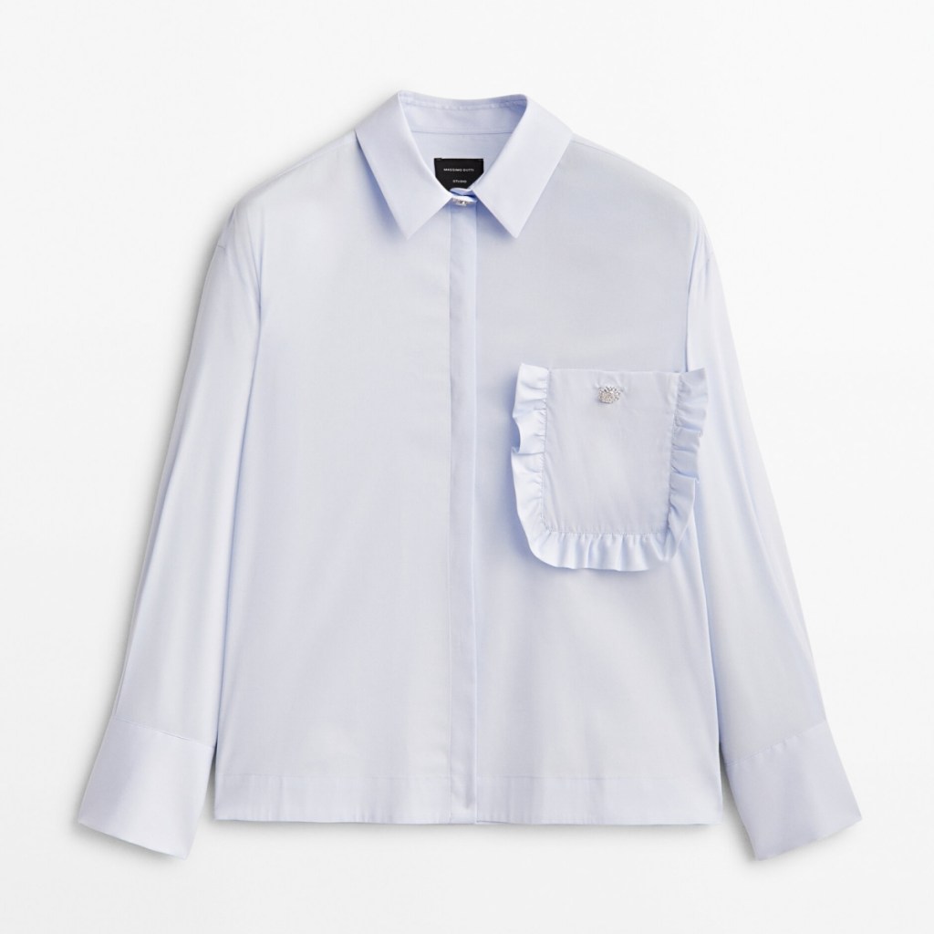 Un modelo confeccionado en fibra natural de algodón que destaca por su coqueto bolsillo de parche superpuesto con detalle de volante, además incluye botones joya tanto en el cuello como en el propio bolsillo y en los puños (79,95 euros).