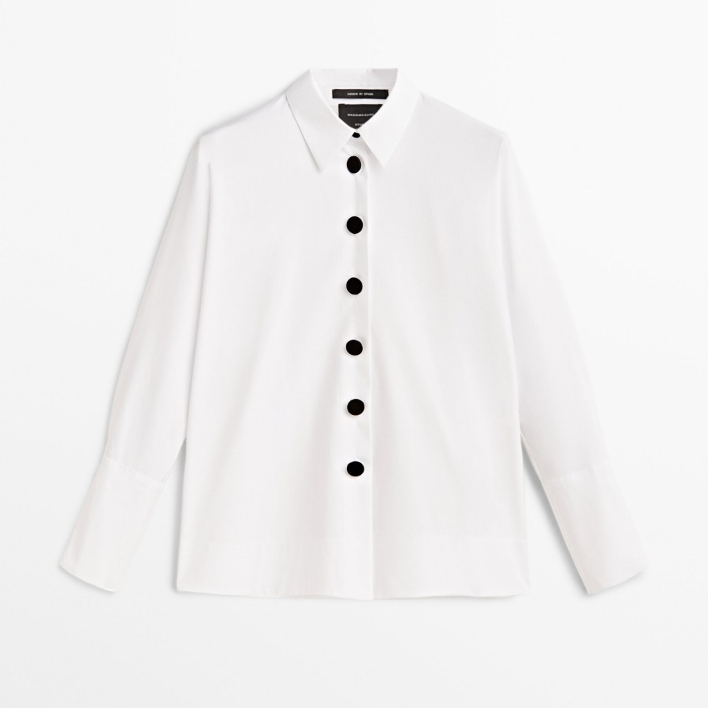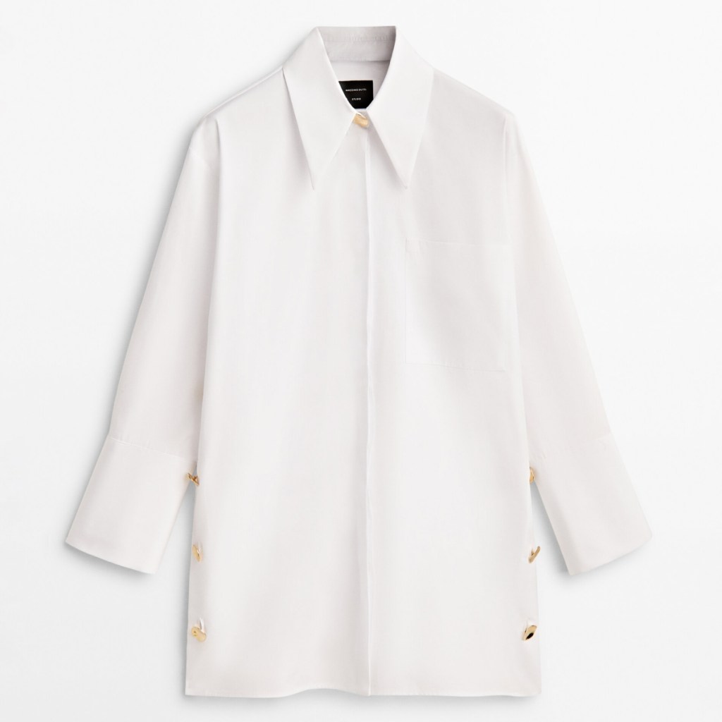 Si te gustan las camisas de corte ‘oversize’, te encantará este diseño realizado en fibra natural de algodón de silueta holgada. Llama la atención porque tiene dos aberturas a ambos lados coronadas por unos bonitos botones dorados, los mismos que luce en cuello y puños (99,95 euros).