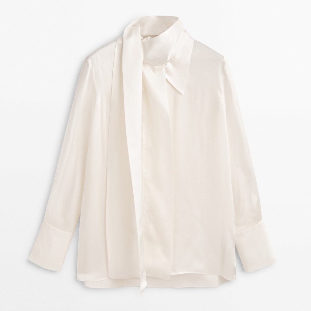 El diseño más romántico de Massimo Dutti Studio está confeccionado con seda morera natural, tiene cuello alto, manga larga, cierre mediante botonadura frontal oculta en la tapeta y cuenta con una llamativa lazada (129 euros).