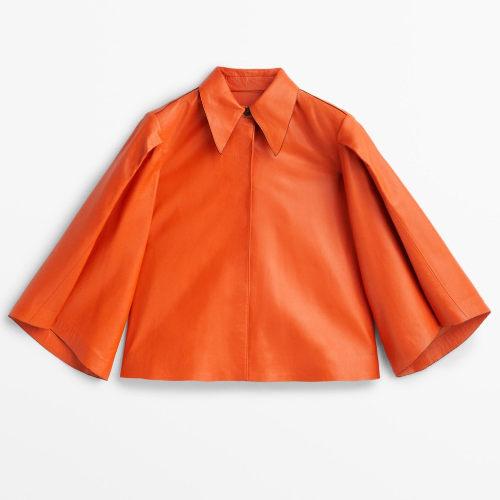 Sin duda, este modelo no puede llamar más la atención por su tonalidad y su originalidad. Se trata de una camisa confeccionada en piel de color naranja con cierre mediante botones tipo snap, con silueta recta y unas amplias mangas (229 euros).
