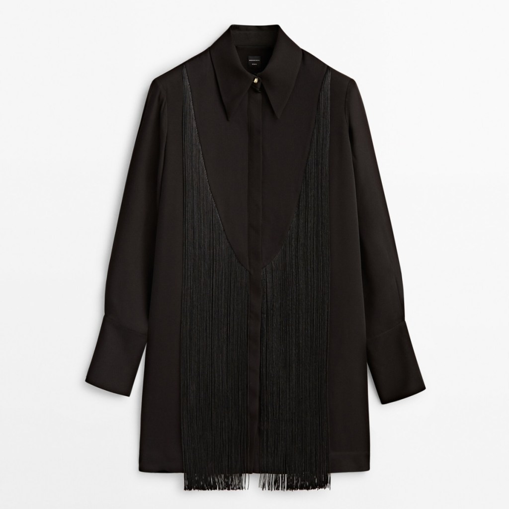 Confeccionada en seda morera natural, esta blusa viste unos flecos extra largos de lo más particulares, que se complementan con los botones dorados del cuello y los puños. Su corte es ‘oversize’ y el cierre mediante botonadura oculta (169 euros).