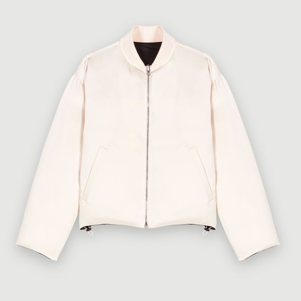 La nueva colección de Maje incluye esta cazadora bomber satinada, de silueta corta y acolchada, que además es reversible. ¡Un dos por uno! Por un lado es blanca, mientras que por el otro es negra. Precio: 375 euros.