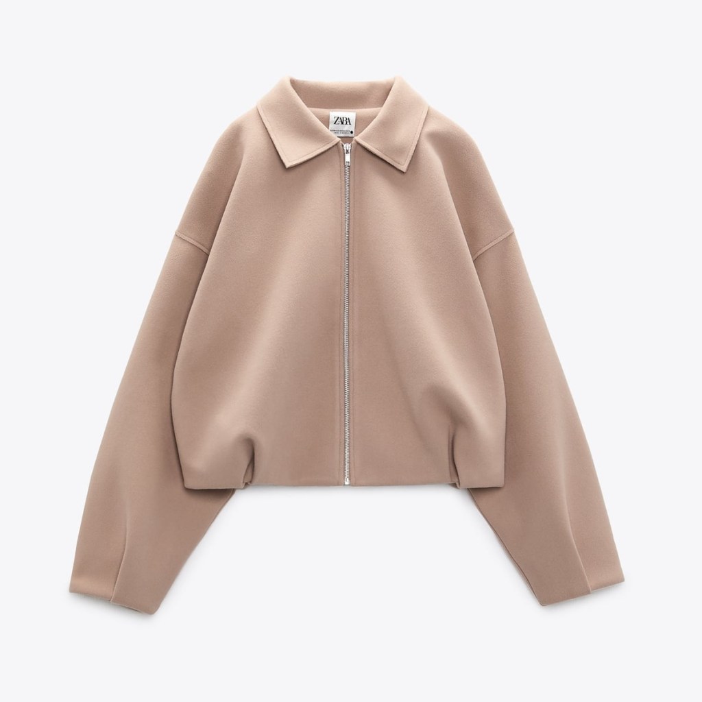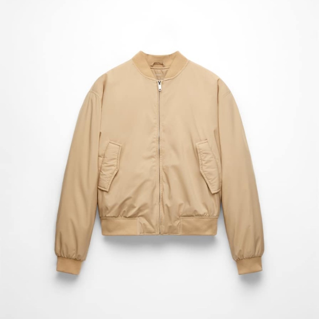 La versión más sofisticada de Zara es esta bomber en color arena con cuello solapa, manga larga, bajo acabado con volumen, detalle de pliegues y costuras. Precio: 29,95 euros.