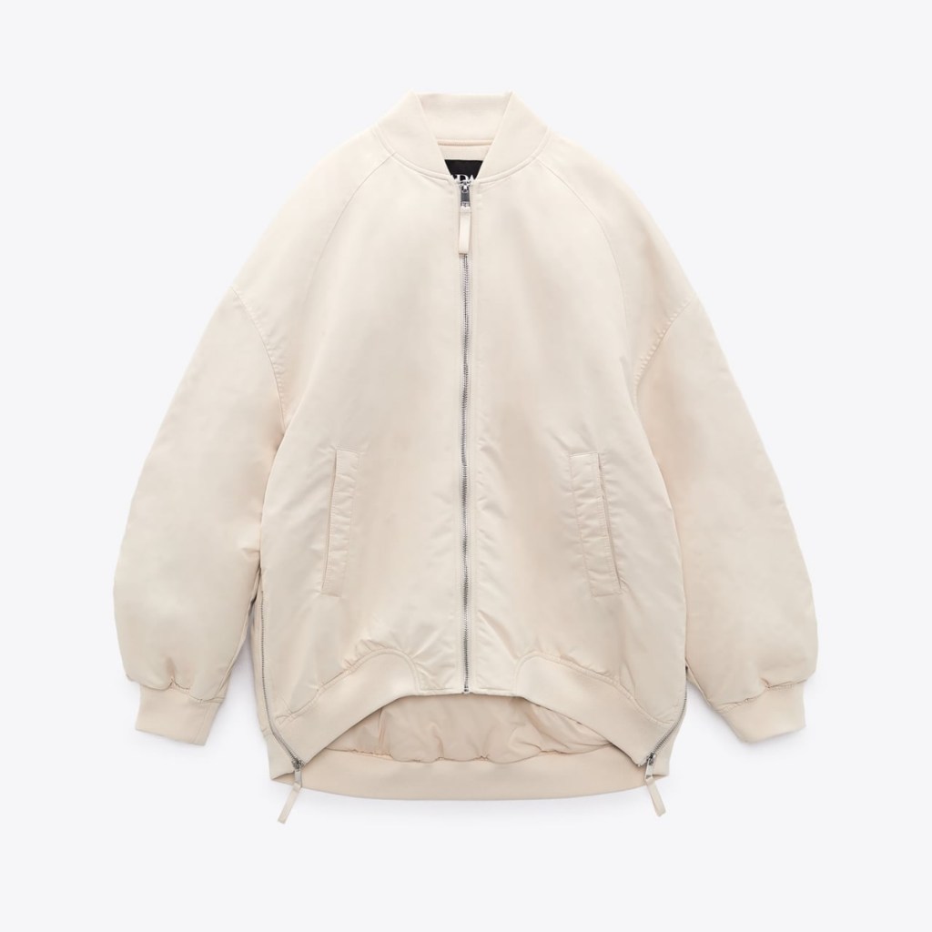 Las amantes de las siluetas holgadas encontrarán en esta bomber de Zara a su mejor aliada. Se trata de una chaqueta ‘oversize’ en color crudo, con cuello redondo, manga larga detalle de fruncidos en las mangas y cremalleras en el delantero. Precio: 49,95 euros.