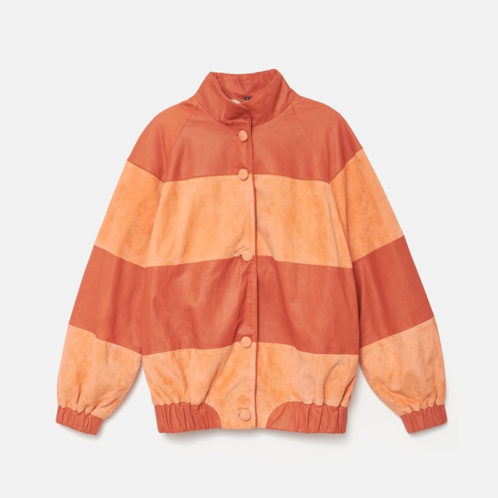 La bomber confeccionada en piel de Himba no puede ser más llamativa. Este modelo de aires retro combina distintos tonos de naranja en forma de rayas XL. A eso le suma los botones forrados en piel, puño y bajo con detalle de piel fruncida. Precio: 359,95 euros.
