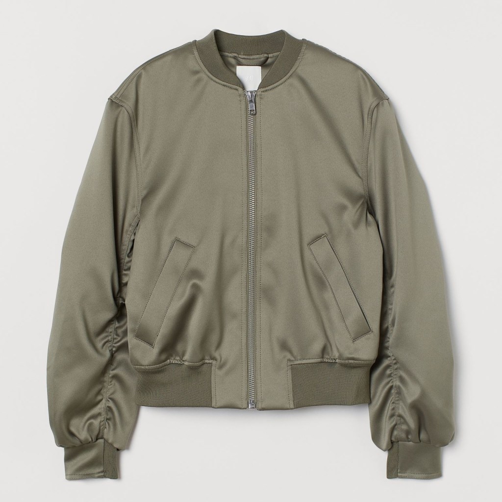 Cazadora bomber en satén de poliéster reciclado, de H&M. Luce costuras fruncidas en las mangas y la espalda, cuello elevado de canalé, bolsillos insertados al bies y hombros ligeramente caídos. Precio: 39,99 euros.