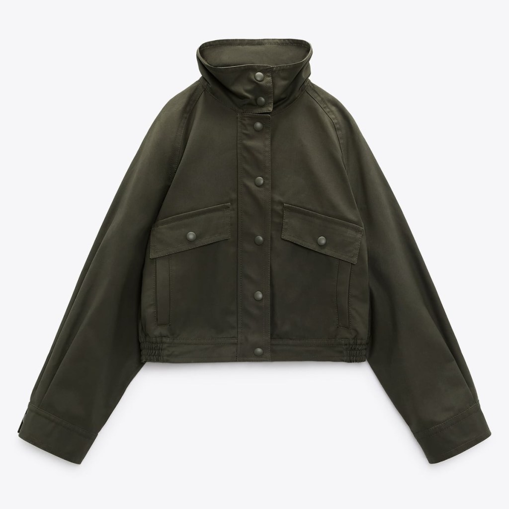 Nos despedimos del clásico cuello redondeado de las bombers tradicionales para abrazar este modelo de Zara confeccionado en tejido con mezcla de algodón. Tiene el cuello subido, manga larga acabada en puños con pliegues y bolsillos con solapa en el delantero. Precio: 79,95 euros.