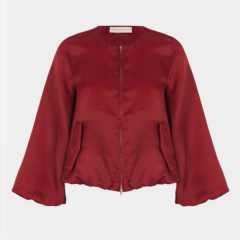 Ya te lo anunciamos y aquí la está. ¡Esta es la bomber que incluso te puedes llevar de boda! Purificación García sofistica al máximo esta prenda al confeccionarla en organza de seda granate, a lo que añade unas bonitas mangas abullonadas, bolsillos laterales con tapeta y bajo con fruncido. Precio: 298 euros.