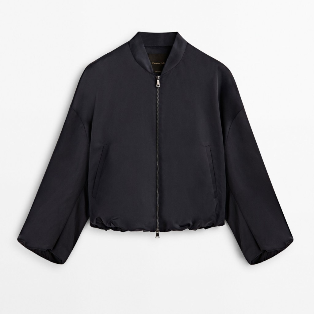 Las mangas con volumen también son las protagonistas del patrón de Massimo Dutti, una bomber azul marino con ligero brillo, bolsillos laterales, puños y bajo fruncido. Precio: 89,95 euros.