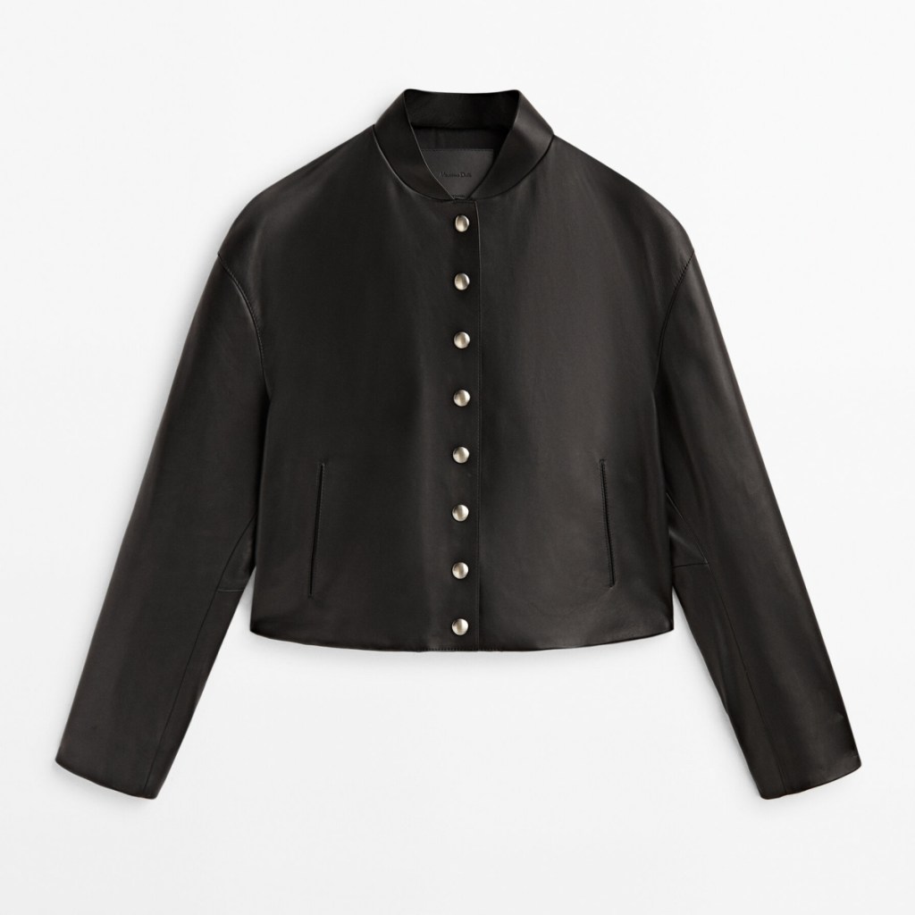 Massimo Dutti repite en esta lista con esta bomber confeccionada en piel con detalle de hombros caídos, cintura elástica en la parte posterior, bolsillos laterales y cierre mediante botones de tipo snap. Precio: 249 euros.
