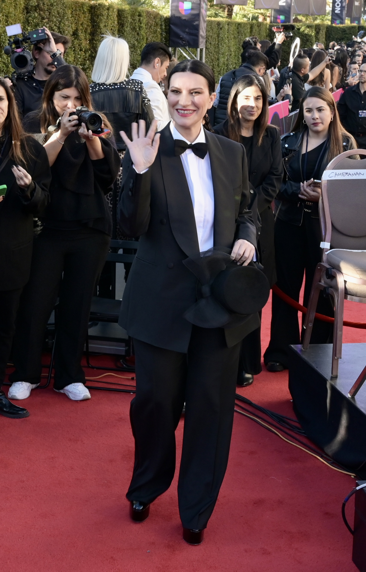 Si a algo le sienta muy bien a Laura Pausini es la sastrería. Para los Premios Lo Nuestro, eligió un maravilloso traje tipo esmoquin, firmado por Lanvin, en su color favorito, el negro. Los combinó con sandalias otorgándole un toque femenino y delicado al look.