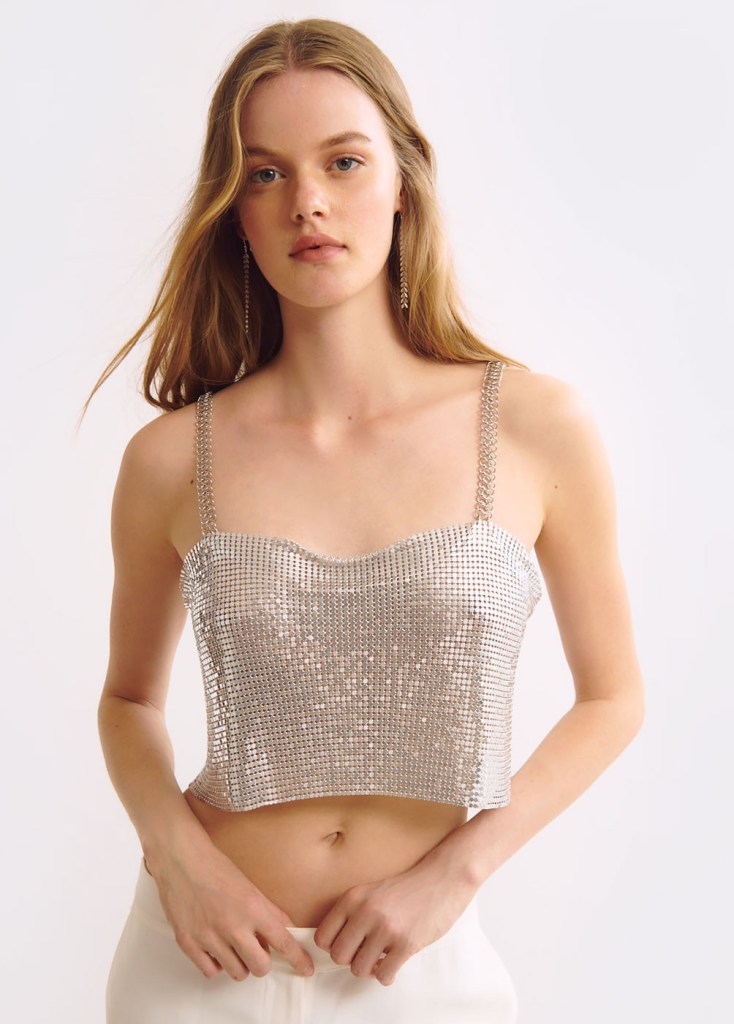 El top de Lucía es tan exclusivo que es complicado de conseguir, pero aún podemos encontrar otras opciones que aunque no sean tan originales ni hechas a mano, nos vendrán como anillo al dedo. Además, teniendo en cuenta lo virales que se han hecho las prendas de metal e incluso de strass, no será complicado conseguir una estilo similar a buen precio.