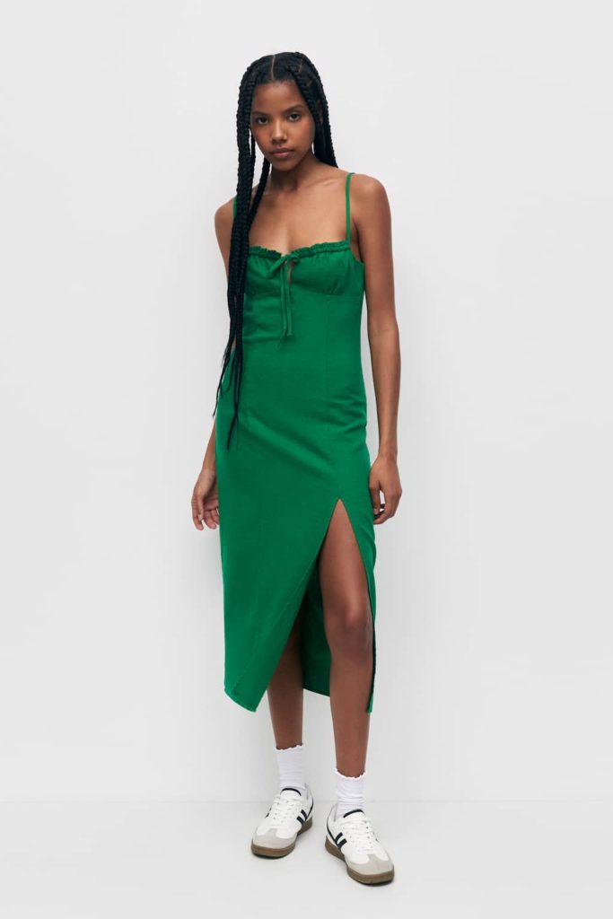 Volviendo a colores vivos tenemos este veraniego vestido midi en verde, que nos encanta por la abertura de la falda y por los detalles del escote. 25,99 euros 19,99 euros.