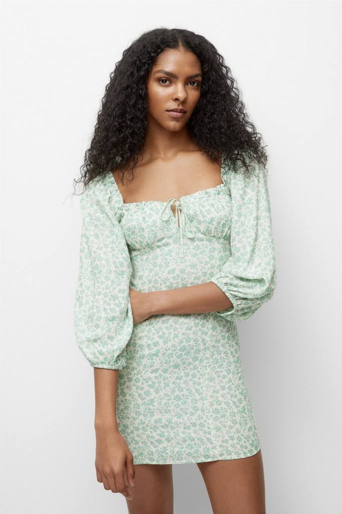 Con un bonito escote de mesonera y unas mangas francesas que nos "obligarán" a llevar este vestido cuando los termómetros no estén disparados, tenemos este diseño estampado por 25,99 euros 19,99 euros.
