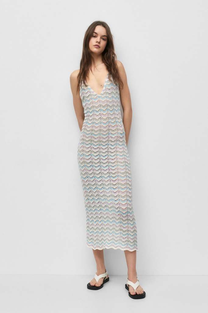 También de crochet nos hemos enamorado de este vestido largo con detalles multicolor por su escote triangular y su ligereza. 29,99 euros 19,99 euros.