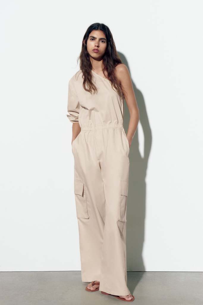 Mono largo de escote asimétrico y con cintura elástica de Zara (19,99 euros)