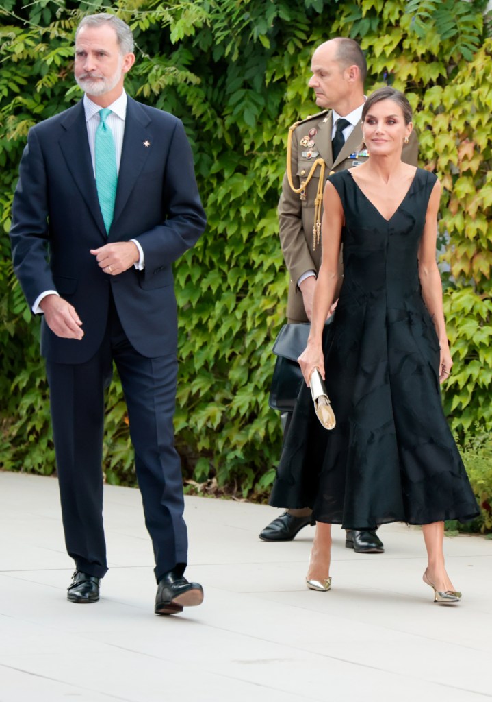 La reina Letizia ha combinado su elegante, sofisticado y rebajado vestido de H&M con unos zapatos de tacón de 5 centímetros de la marca Magrit acabados en punta y un bolso clutch del mismo tono, el dorado.