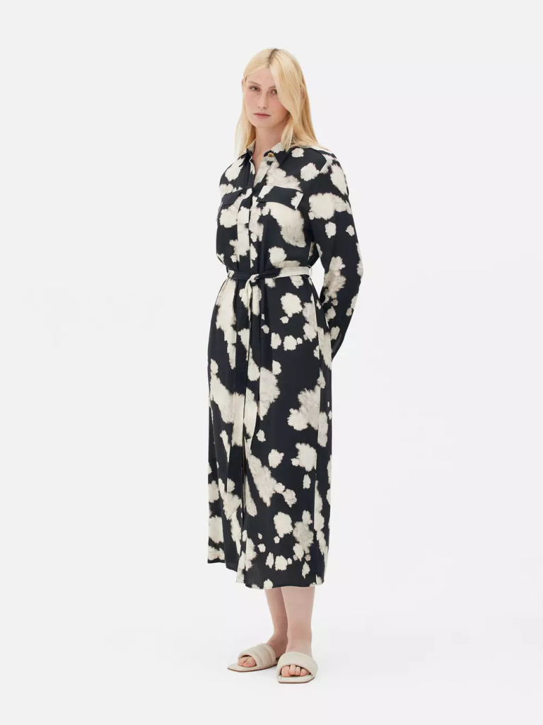 Cambiando a diseños algo más formales tenemos este vestido tipo camisero, con un estampado en tonos negros y blancos y con cinturón para estilizar al máximo la silueta, por 20 euros.