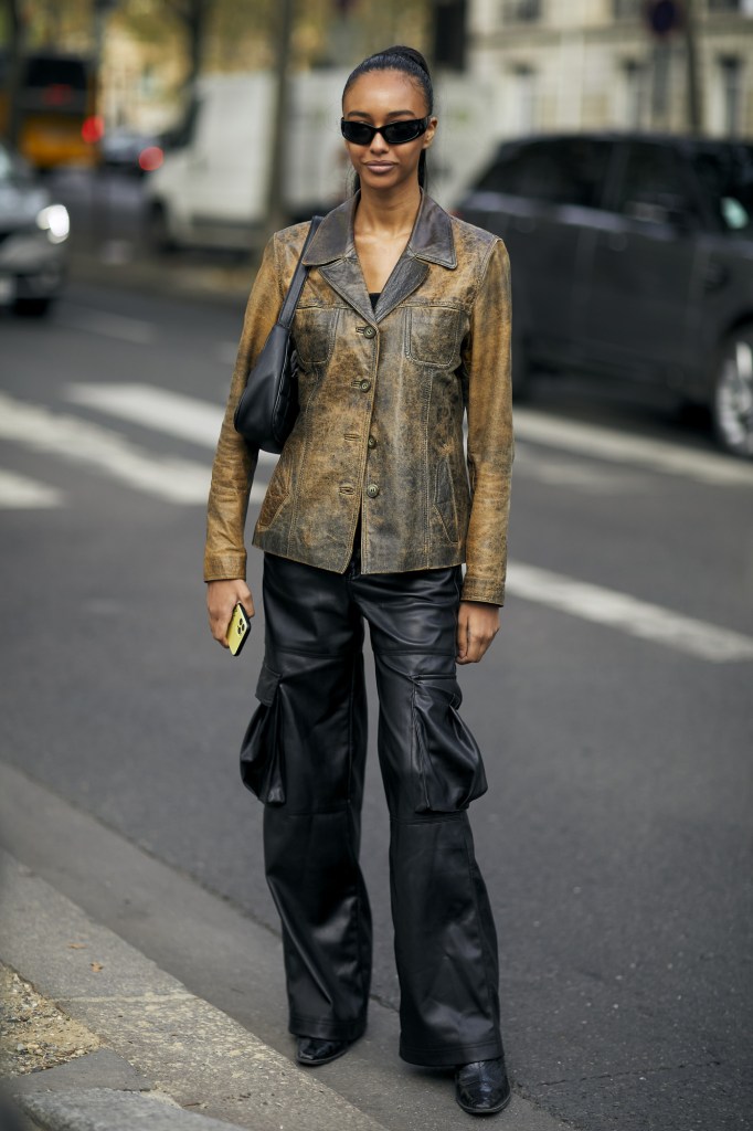 Desde hace unos años hemos empezado a introducir el color en ellos, llenándose el street style de rojos, verdes, marrones o incluso mostazas con los que salir de la rutina de pantalones negros de cuero. También han cambiado en cuanto a siluetas, siendo cada vez más comunes los pantalones cargo efecto piel o pantalones wide leg efecto piel.
