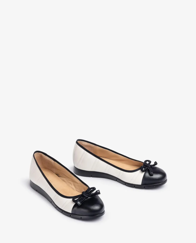 En un regio color blanco, las finas líneas negras que recorren las bailarinas son suficientes para conseguir un acabado impecable, que apetece ponerse tanto con vestidos como con faldas o pantalones, y que lucirá con prácticamente cualquier color que lo combinemos.