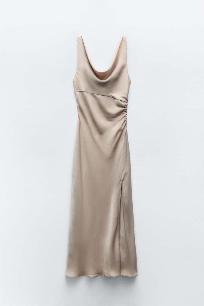 Otra opción estupenda para Navidad es este modelo de Zara. Un vestido midi de tejido drapeado, tirantes finos y bajo con abertura lateral. Precio: 35,95 euros