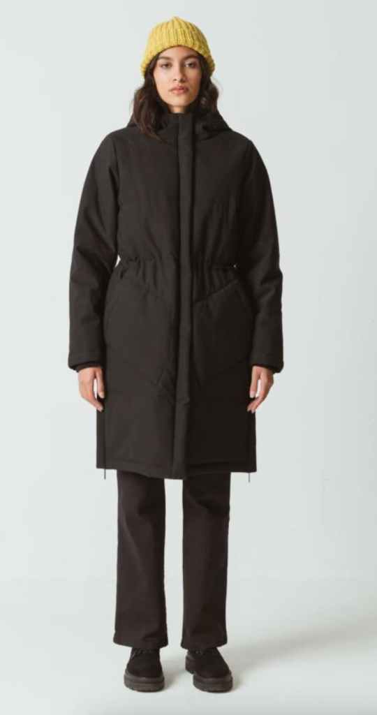 Abrigo acolchado largo de corte recto, hecho principalmente de poliéster reciclado y con un relleno aislante ecológico DuPont Sorona de SKFK. Precio: 259 euros.