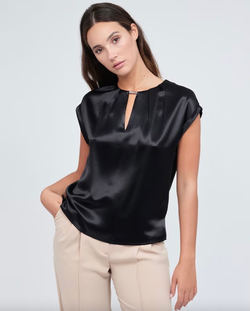 Otra opción elegante y sofisticada es esta blusa satinada con detalle metálico en el escote que está a muy buen precio considerando que es de Calvin Klein (149,00 euros 74,95 euros).