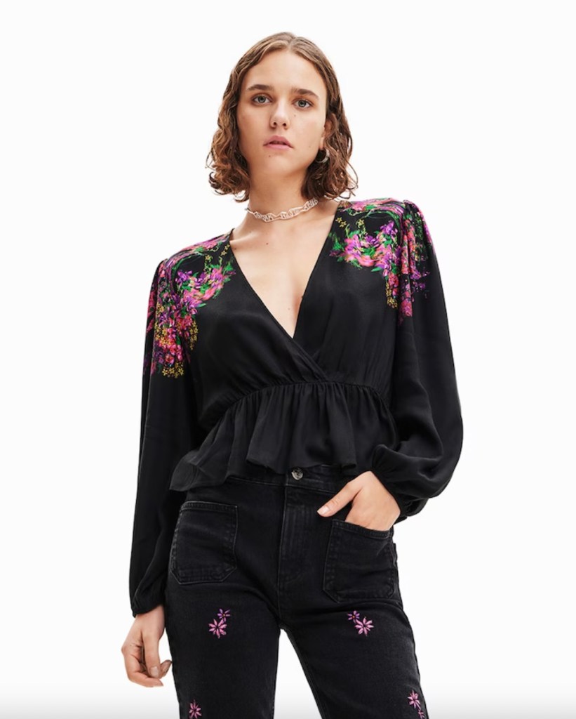 Si quieres un modelo que le agregue algo de color a tu estilismo invernal, no dudes en elegir esta blusa de Desigual. Tiene un diseño cruzado precioso y favorecedor, de escote en V, manga larga abullonada y un estampado floral en la parte superior de lo más delicado. Precio: 79,95 euros 39,97 euros.