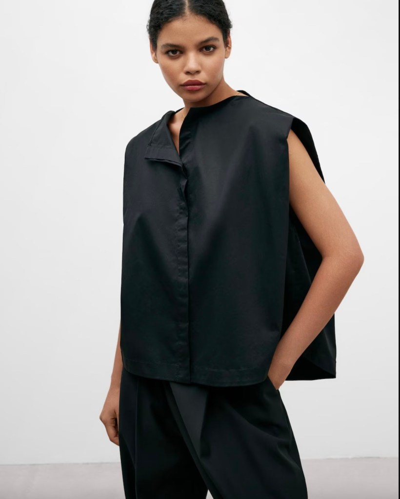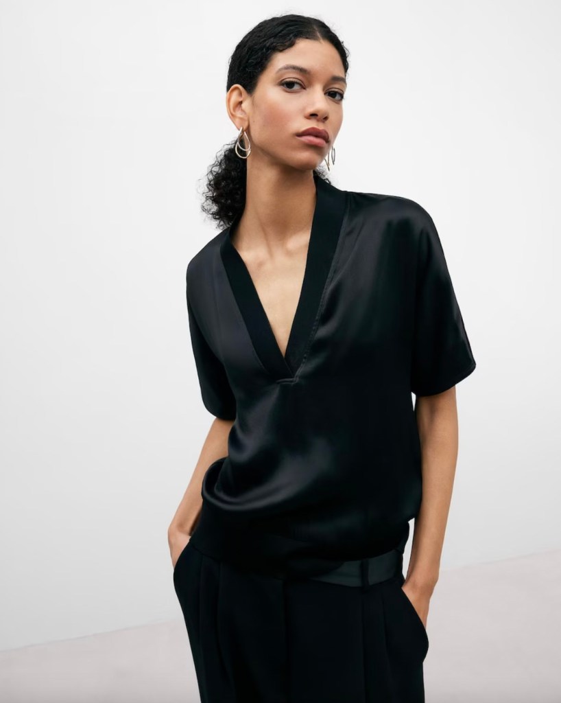 Otra blusa negra ideal para esta temporada (y para cualquiera, realmente) es esta blusa satinada. El cuello en pico es muy estilizador y luce muy bien en todo tipo de cuerpos. Es un modelo de Adolfo Dominguez y tiene un precio increíble. De119,00 euros pasó a costar 49,00 euros.
