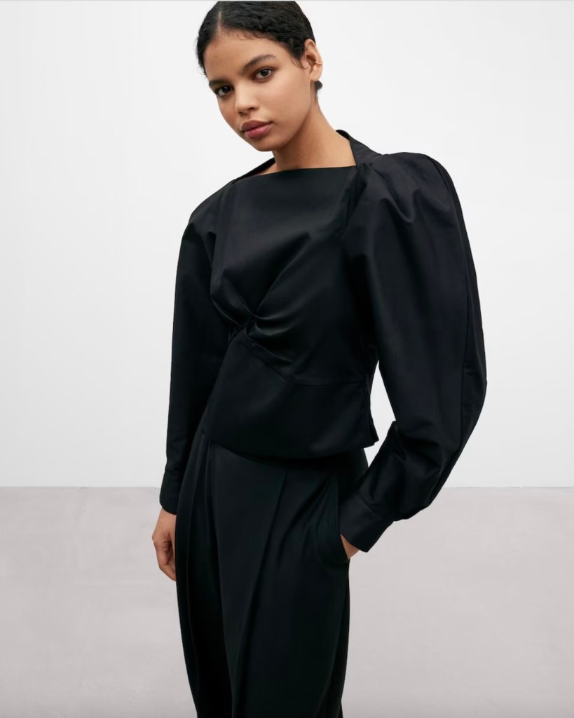 Y por último, una opción muy original y elevada para aquellas que buscan algo distinto. Se trata de una blusa de Adolfo dominguez, tipo wrap con escote barco y manga larga abullonada. Es tan elegante que la puedes llevar a una evento importante, ya sea una boda o cualquier otra celebración. Precio: 149,00 euros 69,00 euros.