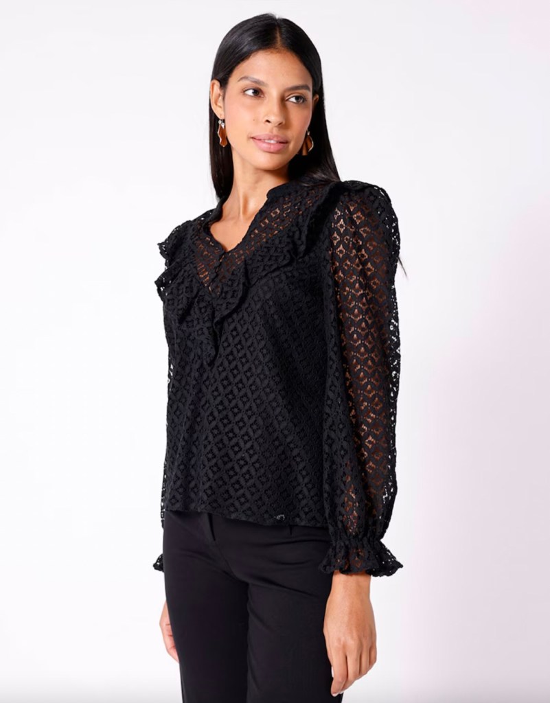Como segunda opción, una blusa de encaje con detalles de volante en el canesú y puños, súper romántica y sofisticada que podrás combinar con pantalones sastre y zapatos de tacón modesto. Es de Naf Naf y cuesta 67,90 euros 32,90 euros.
