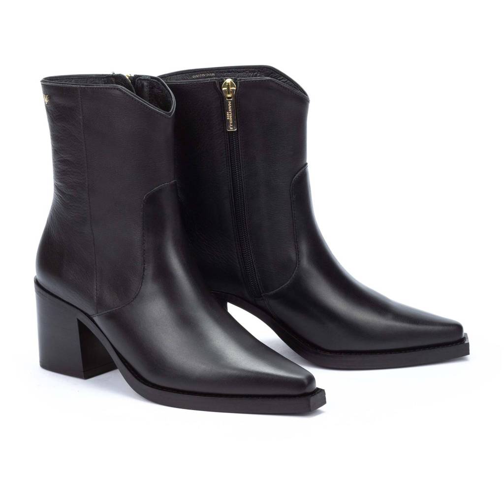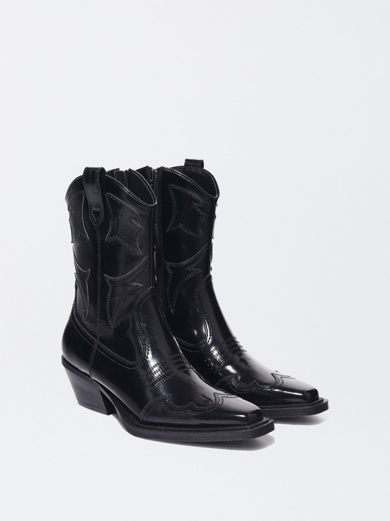 En concreto, hablamos de un botín de tacón medio estilo cowboy que brilla por su original acabado en punta cuadrada. Además, nos encanta el efecto acharolado del material y el tacón es muy cómodo, ya que mide 6 cm. En pocas palabras, es un botín western vibes tradicional con toques modernos.
