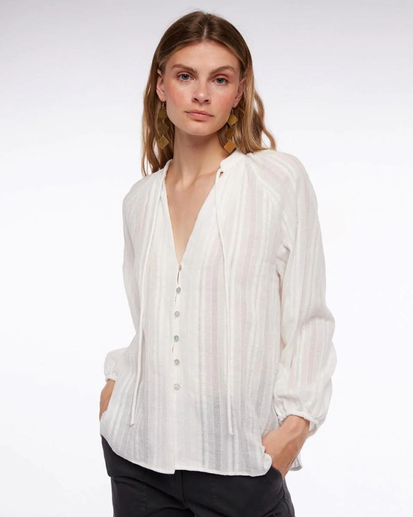 Blusa de color blanco con cuello redondo, escote en pico y cierre frontal con botones de Renatta&Go. Precio: 22,95 euros, 45,95 euros.
