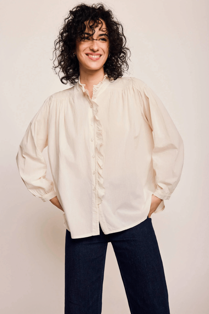 Blusa de estilo romántico con cuello de volantes, manga larga con cierre de botón, bordados en color dorado y cierre frontal de botones de Algo Bonito. Precio: 31,99 euros, 39,99 euros.