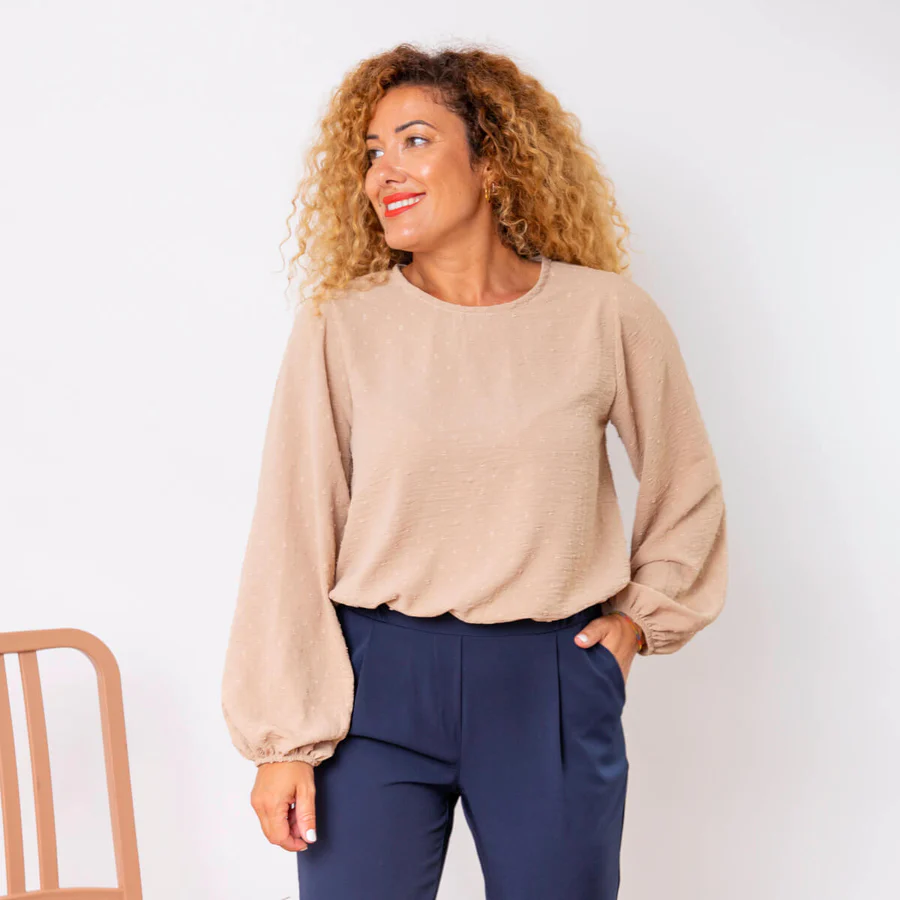 Blusa de plumeti en tono beige con manga poeta de Valentina. Precio: 8,58 euros, 21,99 euros.
