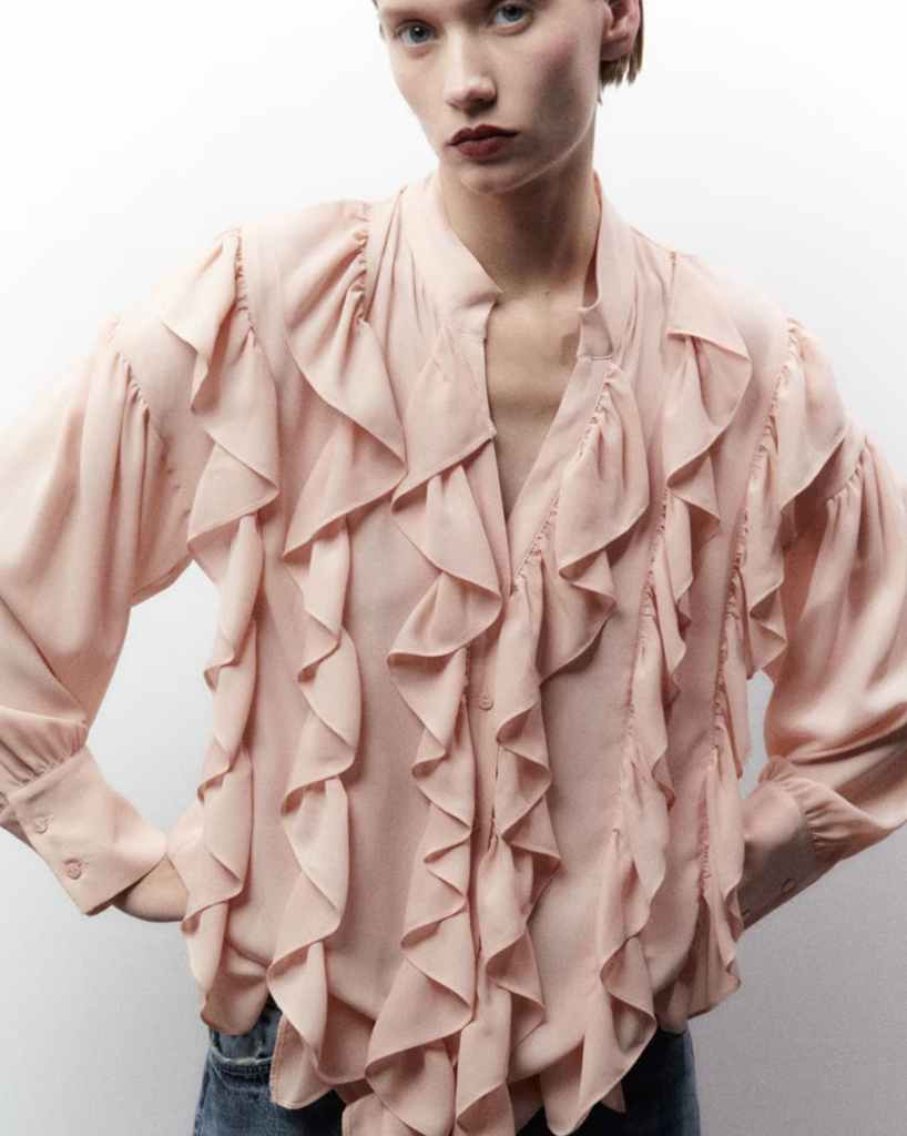 Blusa semitransparente de color rosa palo con manga larga y volantes de Sfera. Precio: 10,75 euros, 35,99 euros en El Corte Inglés.