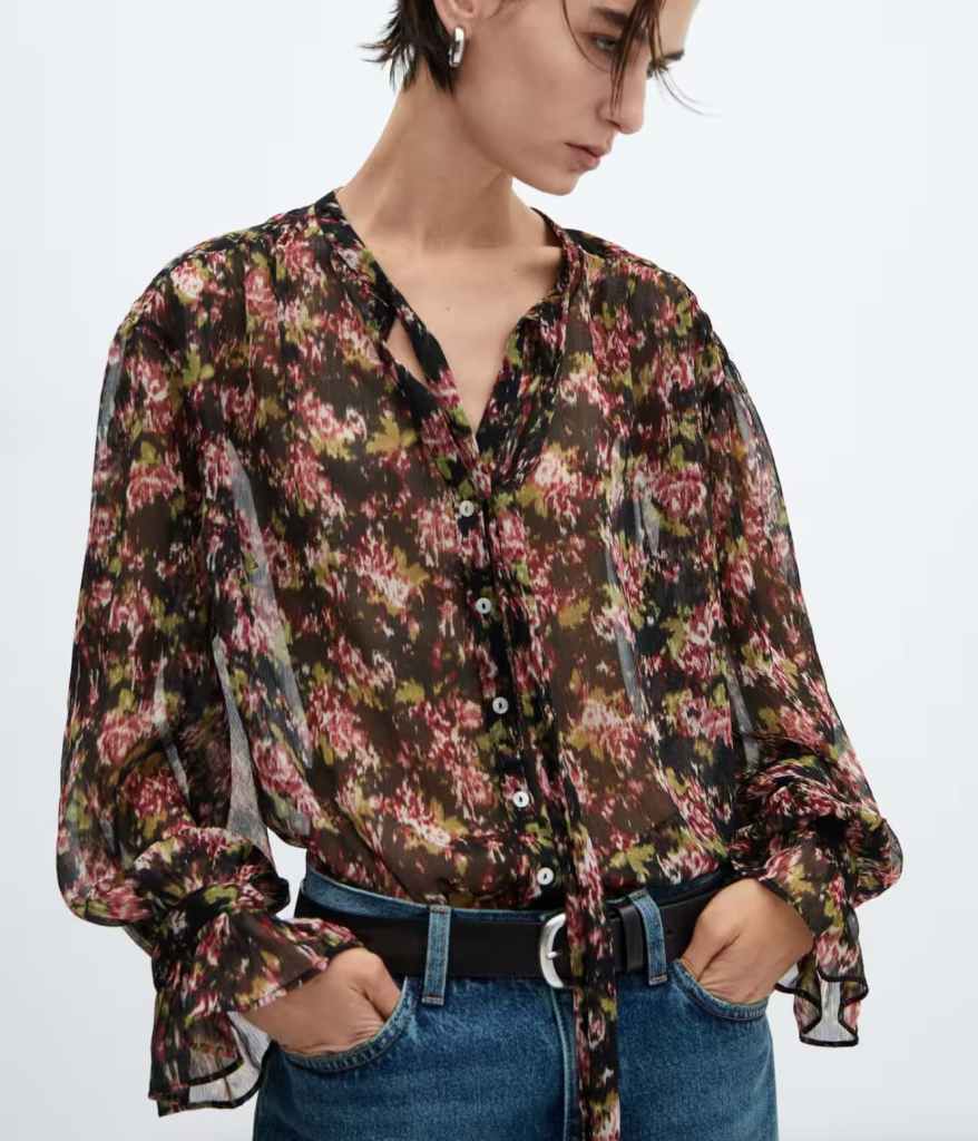 Blusa floral semitransparente con lazada en el cuello y manga abullonada de Mango. Precio: 19,99 euros, 25,99 euros.