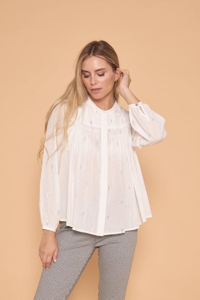 Blusa amplia con cuello caja y plisados con detalle de lurex y manga larga con puños abotonados de Md'M. Precio: 34,98 euros, 69,95 euros.