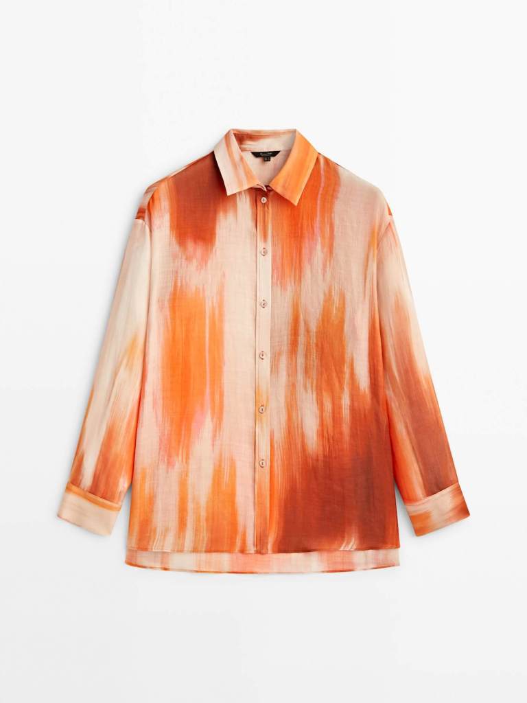 Camisa con estampado tie dye en tonos naranjas confeccionada en tejido 100% ramio. Precio: 39,95 euros, 59,95 euros.
