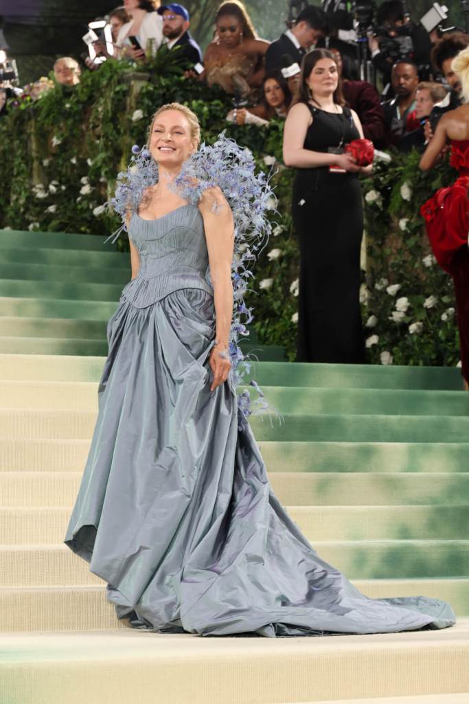 Discreta, fiel a la temática y el dress code a la par que elegante. Así podríamos describir el look de Una Thurman (54 años) en la Met Gala de este año, a la que ha acudido con un diseño de Tory Burch en azul con detalles de flores que acercaron a la actriz de 'Kill Bill' al jardín que tanto buscaban este año.