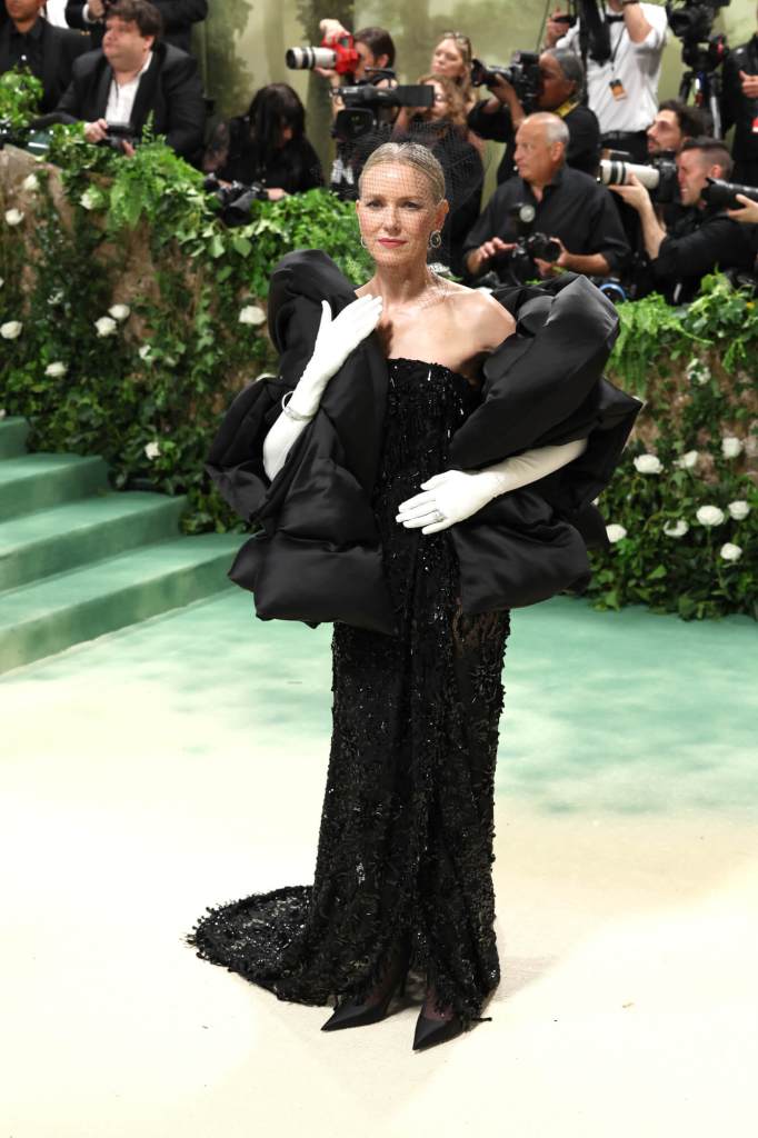 La siempre sofisticada Naomi Watts (55 años) y su elegante look de Balenciaga han sido protagonistas en la alfombra verde de la Met Gala de este año, donde los accesorios han completado a la perfección el vestido, especialmente el tocado, los guantes y la chaqueta acolchada.