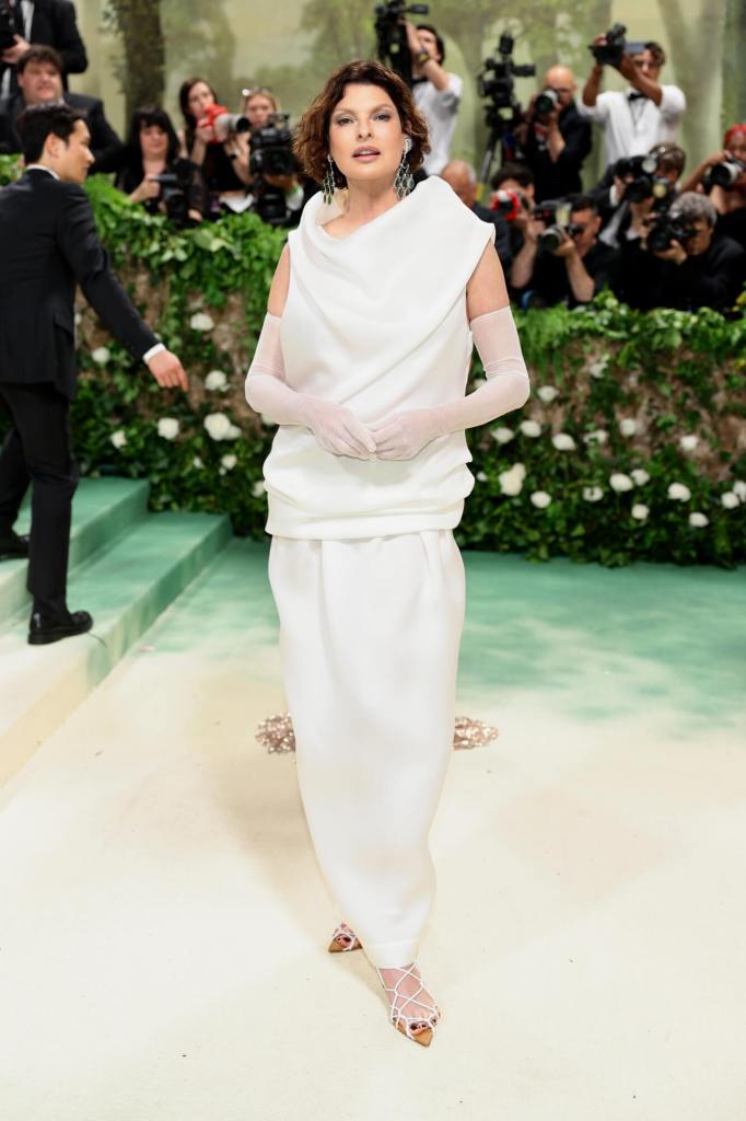 La icónica modelo de los 90 ha reaparecido en la alfombra verde de la Met Gala ocho años después, con un conjunto blanco con guantes a juego de Khaite, confeccionado para ella.