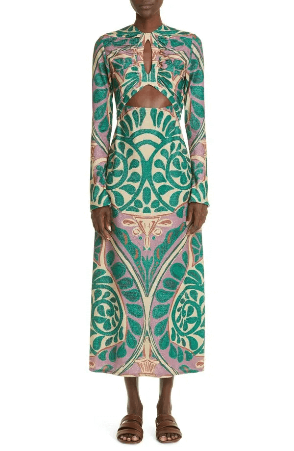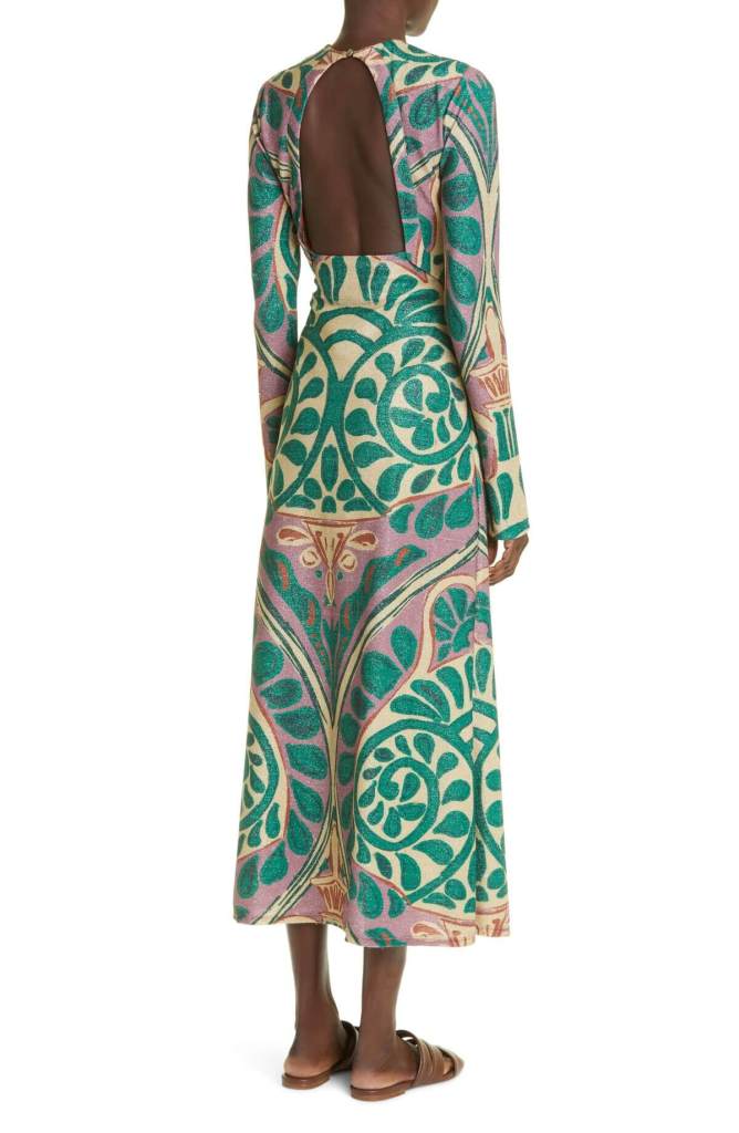 El vestido Dreams Of Amphora ha brillado con luz propia. En concreto, hablamos de un diseño midi que se diferencia gracias a un vibrante estampado dibujado sobre tejido metálico (en el que encontramos fibras de lúrex). Este modelo apuesta por manga larga, cuello caja y un trío de aberturas talladas en la parte delantera y trasera, que otorga un punto mega cool al resultado final.