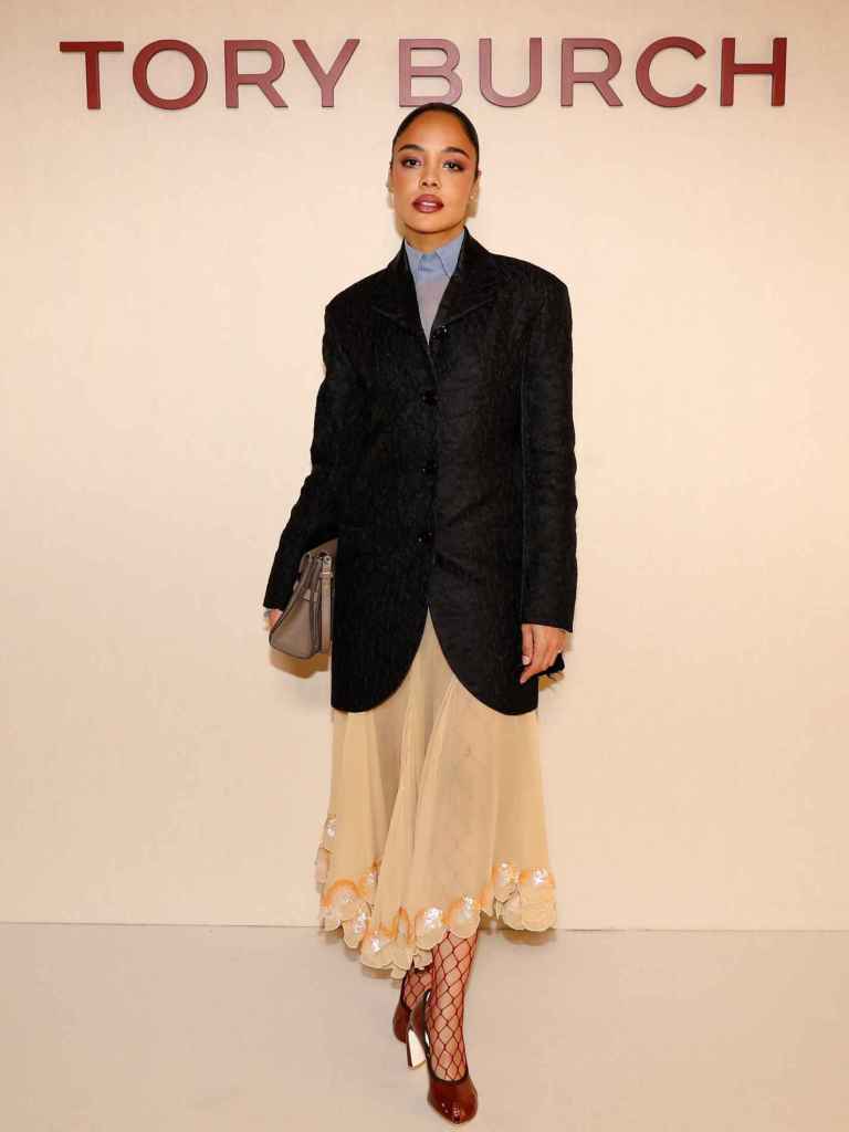Por su parte la actriz Tessa Thompson replicó las medias de rejilla de Jessica Alba, aunque ella las combinó con una falda midi amarilla y una americana negra lisa.
