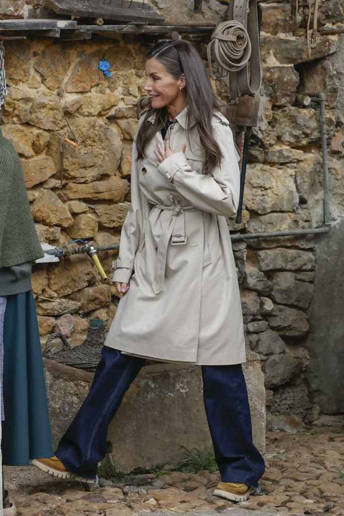 La reina Letizia sorprendió sobre todo por su inesperada elección de calzado. Lució unos elegantes mocasines tipo UGG con suela 'track'. Un calzado de la firma española Pedro García, concretamente el modelo 'Soe', que cuesta 450 euros y está confeccionado en ante con forro de lana. Mientras que en cuanto a ropa escogió una gabardina larga gris, unos vaqueros y un pañuelo para resguardarse del frío.