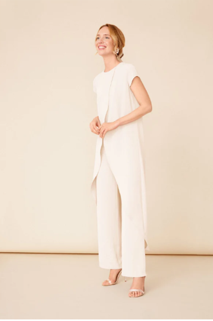 La infanta Sofía decidió apostar por un elegante diseño marca España que le llevó a convertirse en la gran protagonista de la jornada en cuanto a estilo se refiere. La hija menor de los Reyes consiguió acaparar todas las miradas durante la entrega de los Premios Princesa de Girona, gracias a un conjunto ideal compuesto por un top largo y pantalón a juego. Un total white look diseñado por Bruna que combinó con unas bailarinas en tono nude, con detalle de tira de cadena en el empeine y diseñadas por Carolina Herrera, y que acompañó con su mejor melena al aire. Se trata de un conjunto minimalista y de gran estilo en el que destacaba su top asimétrico de manga corta, de cuello a la caja, con diseño de capas cruzadas en la parte delantera y cierre de botón en la zona de la espalda. Un top que se abría al caminar aportando un favorecedor y estiloso movimiento al mismo; que combinó con un pantalón liso a tono, de tiro recto y cintura alta, con cierre de cremallera invisible en la espalda y diseñado también por la mencionada firma española.